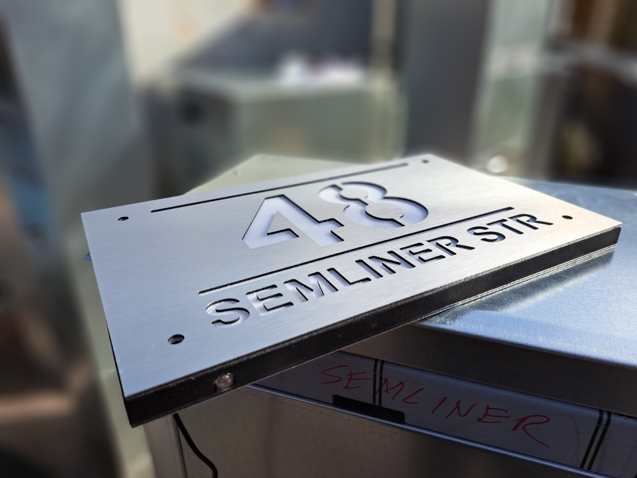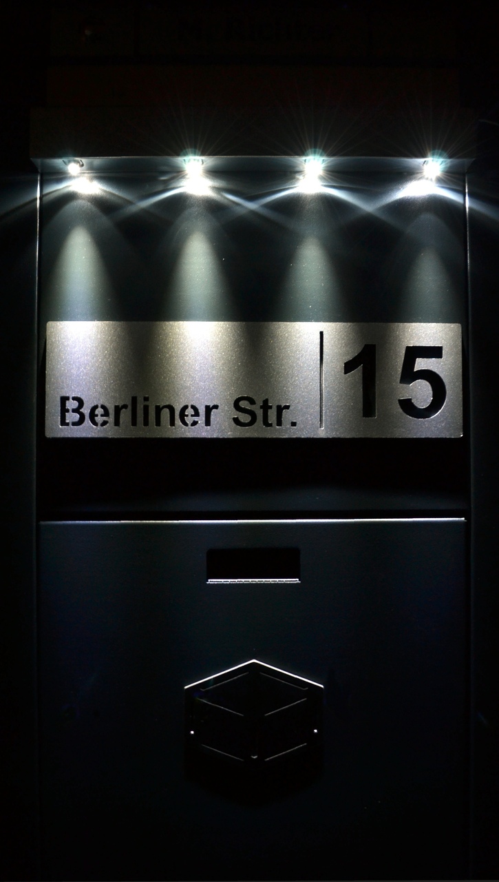 Podświetlenie od strony frontu lub posesji. Dostępna też tabliczka LED 300×250 mm z adresem.